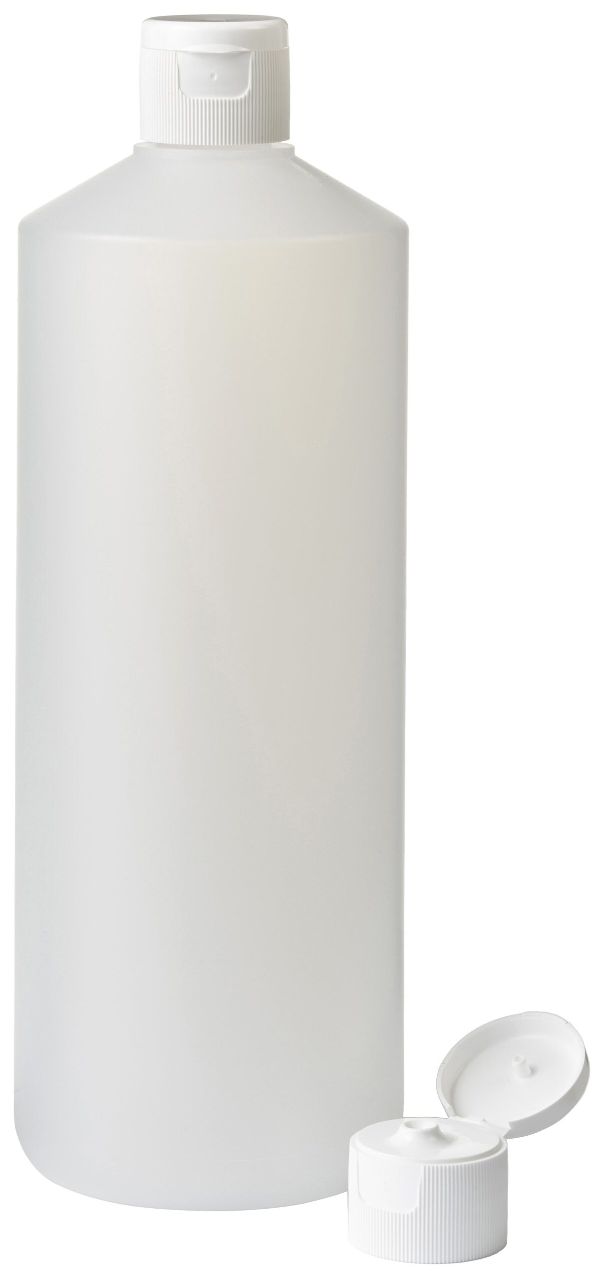 Plastic/kunststof fles 1.000ml rond geproduceerd van het materiaal HDPE (hoge dichtheid polyethyleen) in naturel kleur, ook wel semi transparant genoemd.