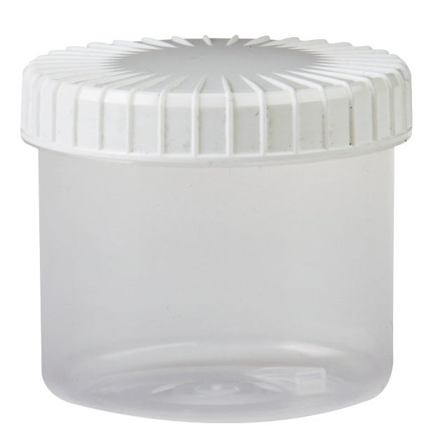 Optipot geproduceerd van het materiaal PP (polypropyleen) transparant met losse PP wit geribbeld deksel mee verpakt in doos.